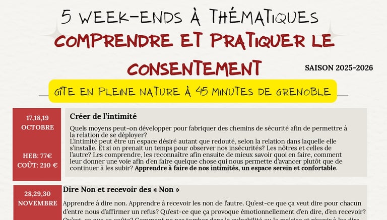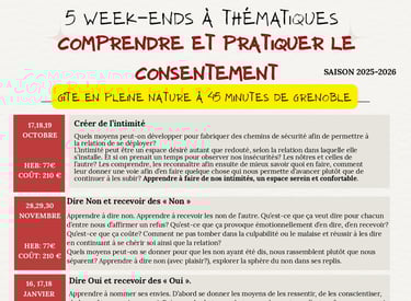 Nous offrons des ateliers et stages pour assimiler des outils de consentement dans vos relations humaines et aller en profondeur dans les résistances, les mauvaises habitudes liées à nos éducations genrées, nos traumas, nos défenses vitales et nos envies de changement!