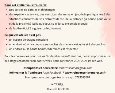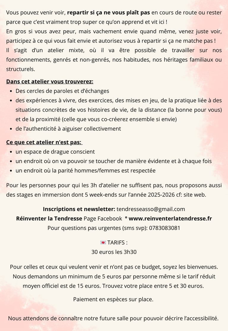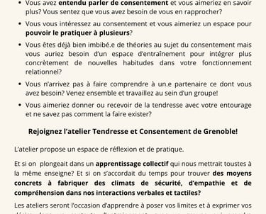 Une fois par mois, dans une salle à Grenoble, l'atelier tendresse et consentement à lieu, pendant 3h d'animation et du temps informel ensuite si envie. Vous pouvez rester le temps que vous voulez. Vous pouvez venir voir et repartir, sans vous justifier.